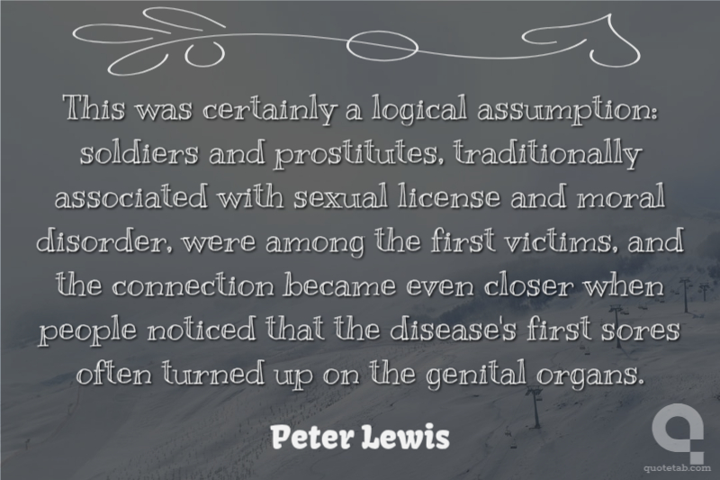 This was certainly a logical assumption: soldiers and prostitutes, traditionally associated with sexual license and moral disorder, were among the first victims, and the connection became even closer when people noticed that the disease's first sores often turned up on the genital organs.