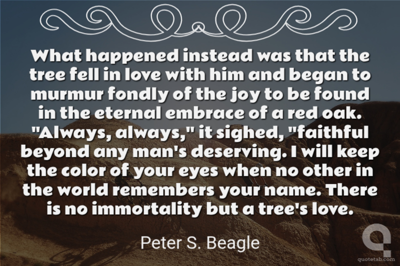 What happened instead was that the tree fell in love with him and began to murmur fondly of the joy to be found in the eternal embrace of a red oak. "Always, always," it sighed, "faithful beyond any man's deserving. I will keep the color of your eyes when no other in the world remembers your name. There is no immortality but a tree's love.