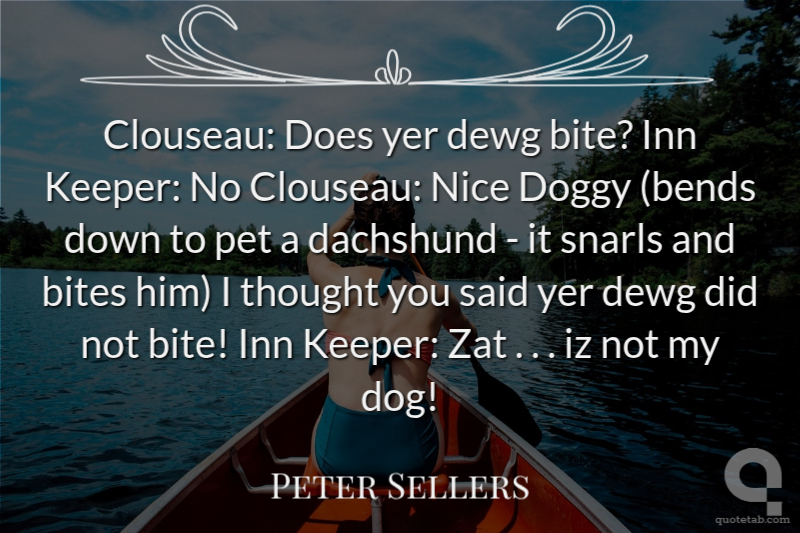 Clouseau: Does yer dewg bite? Inn Keeper: No Clouseau: Nice Doggy (bends down to pet a dachshund - it snarls and bites him) I thought you said yer dewg did not bite! Inn Keeper: Zat . . . iz not my dog!