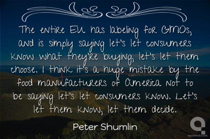 The entire EU has labeling for GMOs, and is simply saying let's let consumers know what they're buying, let's let them choose. I think it's a huge mistake by the food manufacturers of America not to be saying let's let consumers know. Let's let them know, let them decide.