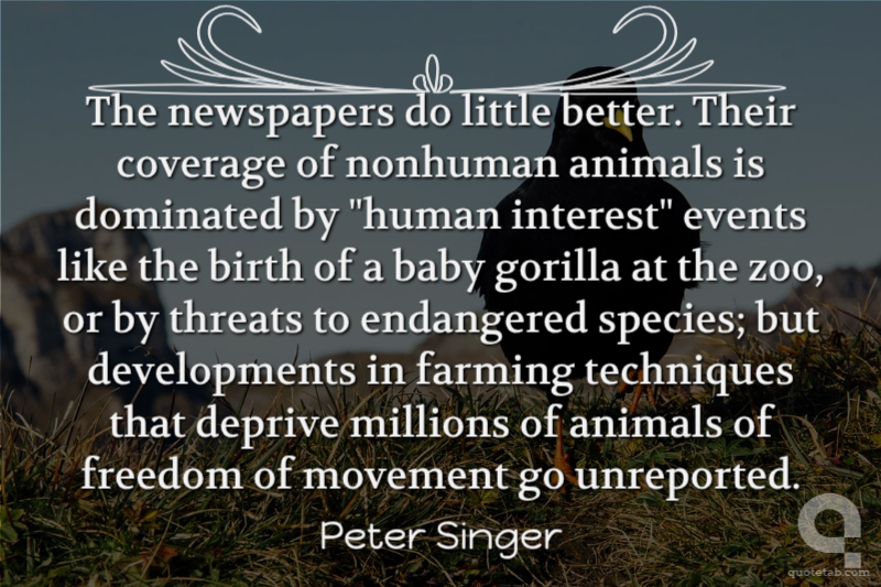 The newspapers do little better. Their coverage of nonhuman animals is dominated by "human interest" events like the birth of a baby gorilla at the zoo, or by threats to endangered species; but developments in farming techniques that deprive millions of animals of freedom of movement go unreported.