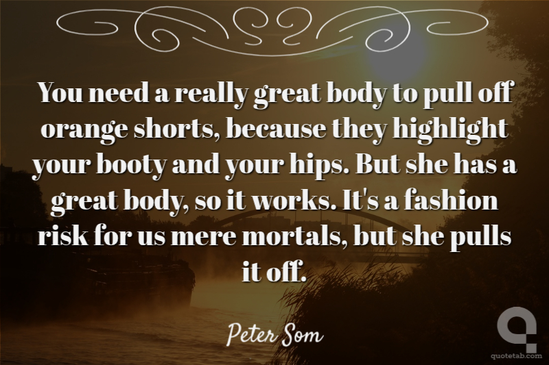 You need a really great body to pull off orange shorts, because they highlight your booty and your hips. But she has a great body, so it works. It's a fashion risk for us mere mortals, but she pulls it off.