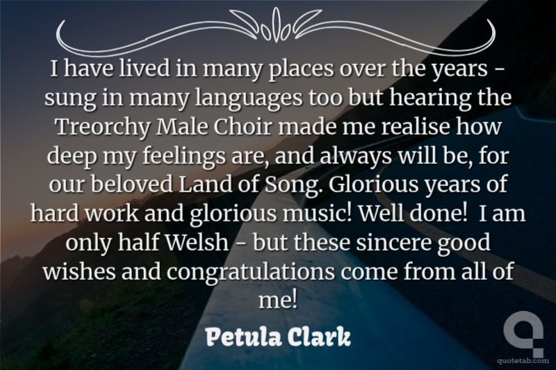 I have lived in many places over the years - sung in many languages too but hearing the Treorchy Male Choir made me realise how deep my feelings are, and always will be, for our beloved Land of Song. Glorious years of hard work and glorious music! Well done! I am only half Welsh - but these sincere good wishes and congratulations come from all of me!