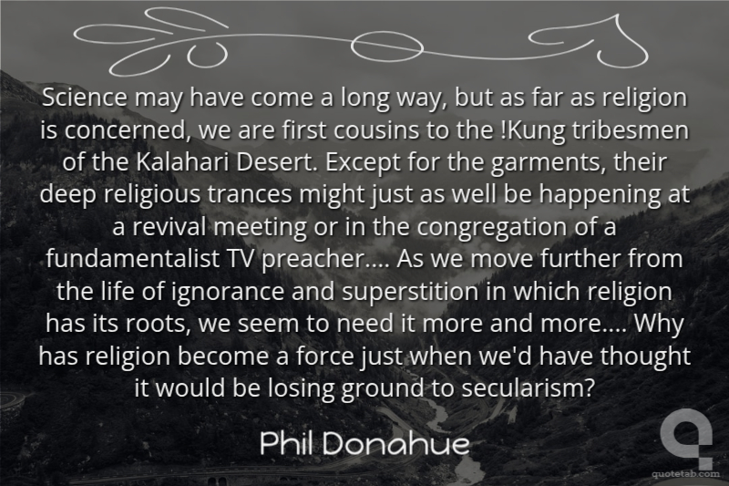 Science may have come a long way, but as far as religion is concerned, we are first cousins to the !Kung tribesmen of the Kalahari Desert. Except for the garments, their deep religious trances might just as well be happening at a revival meeting or in the congregation of a fundamentalist TV preacher.... As we move further from the life of ignorance and superstition in which religion has its roots, we seem to need it more and more.... Why has religion become a force just when we'd have thought it would be losing ground to secularism?