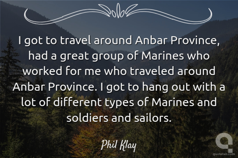 I got to travel around Anbar Province, had a great group of Marines who worked for me who traveled around Anbar Province. I got to hang out with a lot of different types of Marines and soldiers and sailors.