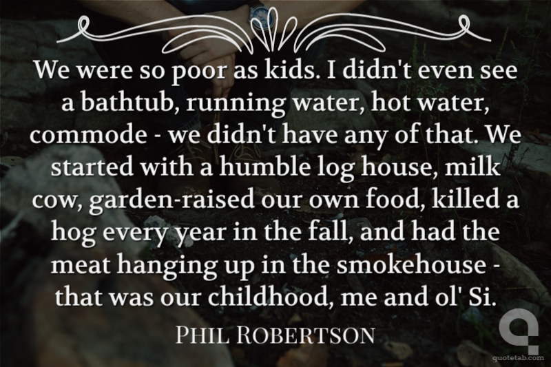 We were so poor as kids. I didn't even see a bathtub, running water, hot water, commode - we didn't have any of that. We started with a humble log house, milk cow, garden-raised our own food, killed a hog every year in the fall, and had the meat hanging up in the smokehouse - that was our childhood, me and ol' Si.