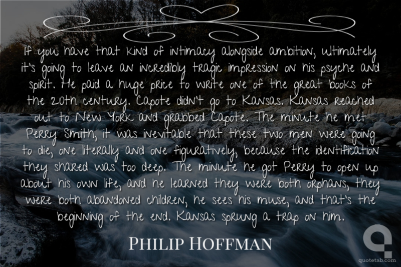 If you have that kind of intimacy alongside ambition, ultimately it's going to leave an incredibly tragic impression on his psyche and spirit. He paid a huge price to write one of the great books of the 20th century. Capote didn't go to Kansas. Kansas reached out to New York and grabbed Capote. The minute he met Perry Smith, it was inevitable that these two men were going to die, one literally and one figuratively, because the identification they shared was too deep. The minute he got Perry to open up about his own life, and he learned they were both orphans, they were both abandoned children, he sees his muse, and that's the beginning of the end. Kansas sprung a trap on him.