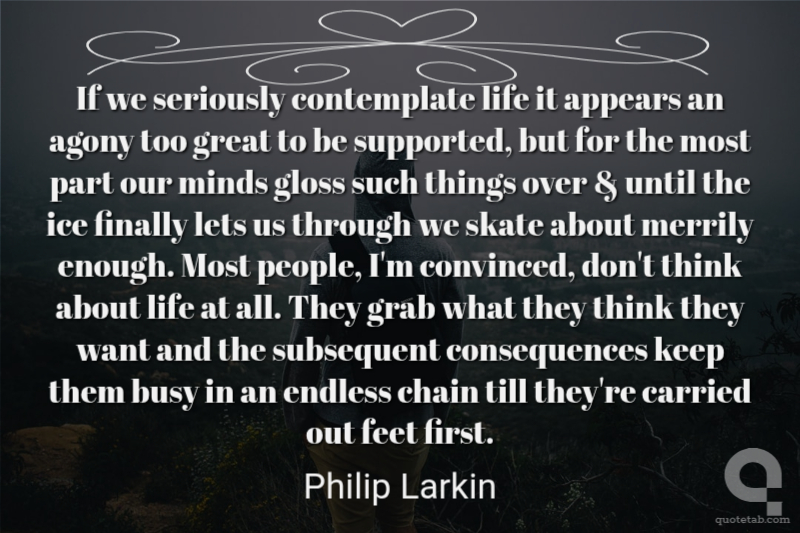 If we seriously contemplate life it appears an agony too great to be supported, but for the most part our minds gloss such things over & until the ice finally lets us through we skate about merrily enough. Most people, I'm convinced, don't think about life at all. They grab what they think they want and the subsequent consequences keep them busy in an endless chain till they're carried out feet first.