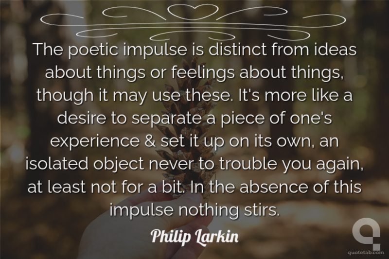 The poetic impulse is distinct from ideas about things or feelings about things, though it may use these. It's more like a desire to separate a piece of one's experience & set it up on its own, an isolated object never to trouble you again, at least not for a bit. In the absence of this impulse nothing stirs.