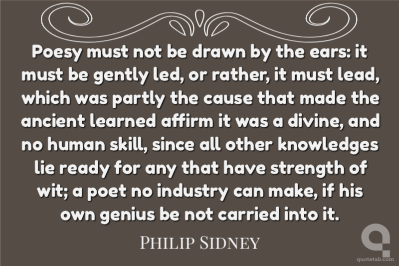 Poesy must not be drawn by the ears: it must be gently led, or rather, it must lead, which was partly the cause that made the ancient learned affirm it was a divine, and no human skill, since all other knowledges lie ready for any that have strength of wit; a poet no industry can make, if his own genius be not carried into it.
