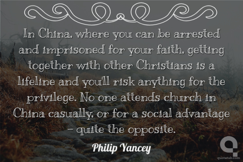 In China, where you can be arrested and imprisoned for your faith, getting together with other Christians is a lifeline and you'll risk anything for the privilege. No one attends church in China casually, or for a social advantage - quite the opposite.
