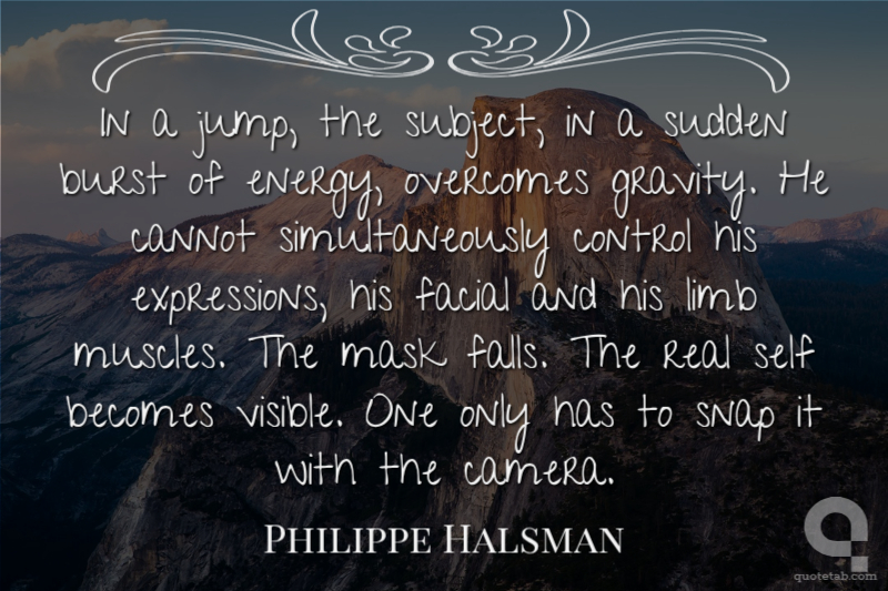 In a jump, the subject, in a sudden burst of energy, overcomes gravity. He cannot simultaneously control his expressions, his facial and his limb muscles. The mask falls. The real self becomes visible. One only has to snap it with the camera.