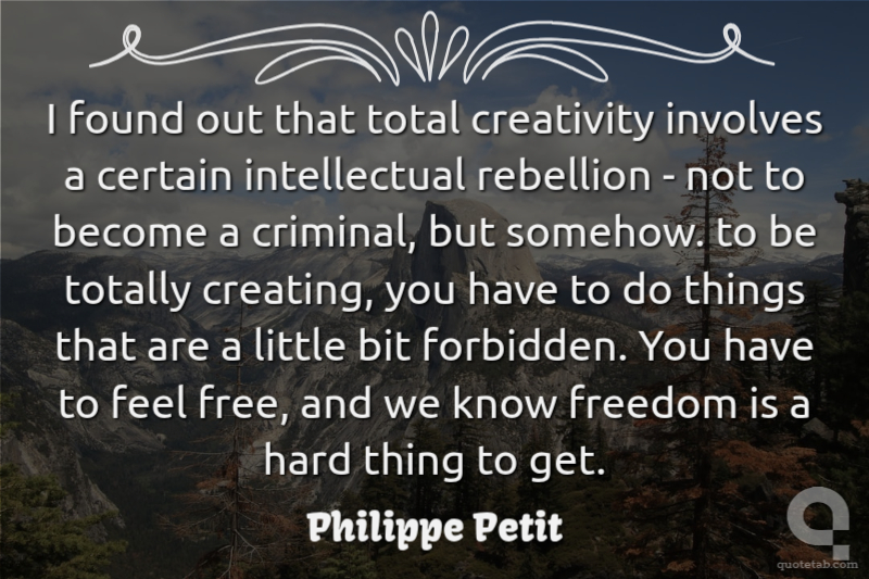 I found out that total creativity involves a certain intellectual rebellion - not to become a criminal, but somehow. to be totally creating, you have to do things that are a little bit forbidden. You have to feel free, and we know freedom is a hard thing to get.