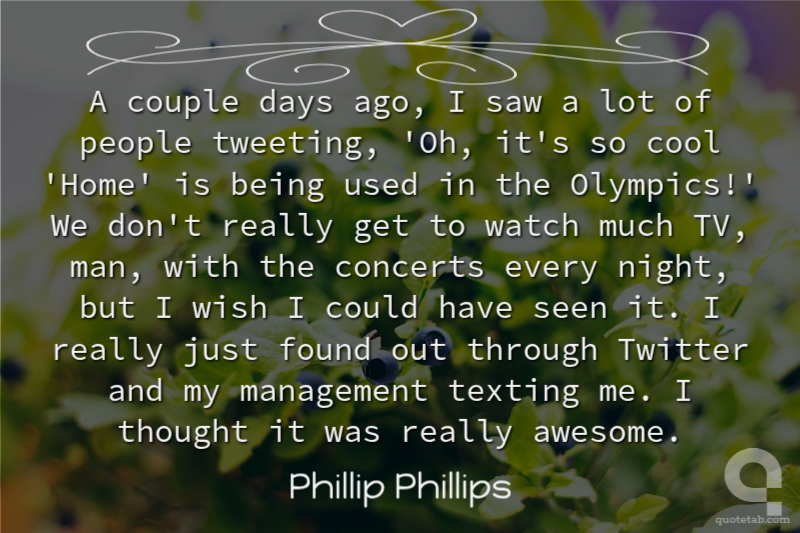 A couple days ago, I saw a lot of people tweeting, 'Oh, it's so cool 'Home' is being used in the Olympics!' We don't really get to watch much TV, man, with the concerts every night, but I wish I could have seen it. I really just found out through Twitter and my management texting me. I thought it was really awesome.