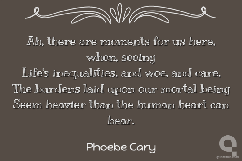 Ah, there are moments for us here, when, seeing Life's inequalities, and woe, and care, The burdens laid upon our mortal being Seem heavier than the human heart can bear.