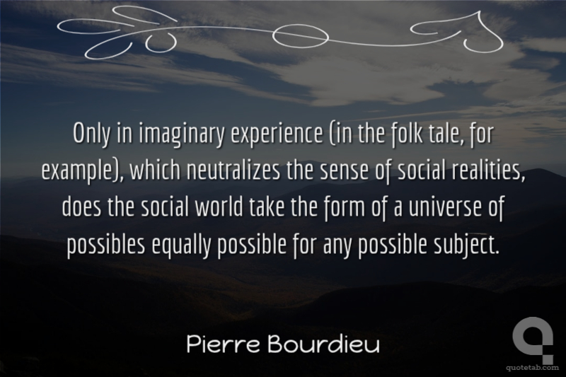 Only in imaginary experience (in the folk tale, for example), which neutralizes the sense of social realities, does the social world take the form of a universe of possibles equally possible for any possible subject.