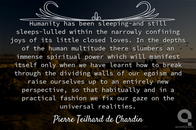Humanity has been sleeping-and still sleeps-lulled within the narrowly confining joys of its little closed loves. In the depths of the human multitude there slumbers an immense spiritual power which will manifest itself only when we have learnt how to break through the dividing walls of our egoism and raise ourselves up to an entirely new perspective, so that habitually and in a practical fashion we fix our gaze on the universal realities.