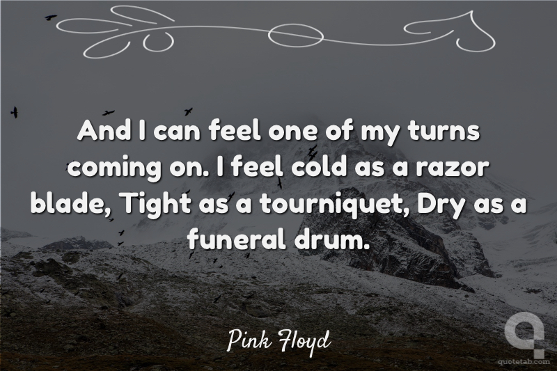 And I can feel one of my turns coming on. I feel cold as a razor blade, Tight as a tourniquet, Dry as a funeral drum.