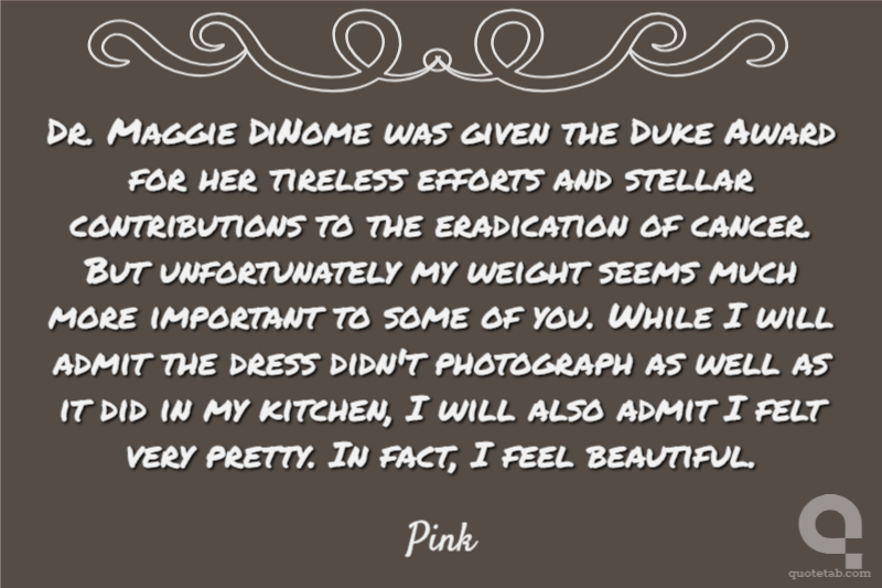 Dr. Maggie DiNome was given the Duke Award for her tireless efforts and stellar contributions to the eradication of cancer. But unfortunately my weight seems much more important to some of you. While I will admit the dress didn't photograph as well as it did in my kitchen, I will also admit I felt very pretty. In fact, I feel beautiful.