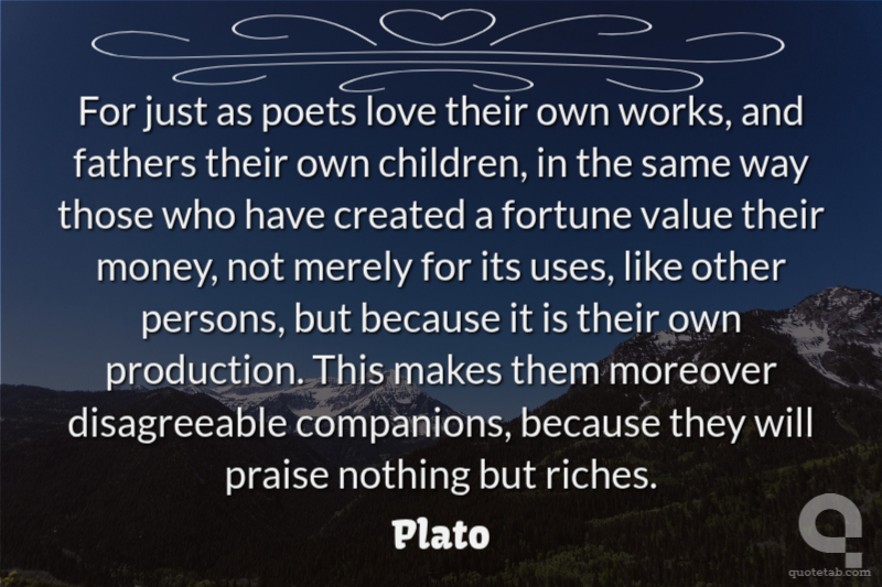 . . . you did not seem to me over-fond of money. And this is the way in general with those who have not made it themselves, while those who have are twice as fond of it as anyone else. For just as poets are fond of their own poems, and fathers of their own children, so money-makers become devoted to money, not only because, like other people, they find it useful, but because it's their own creation.