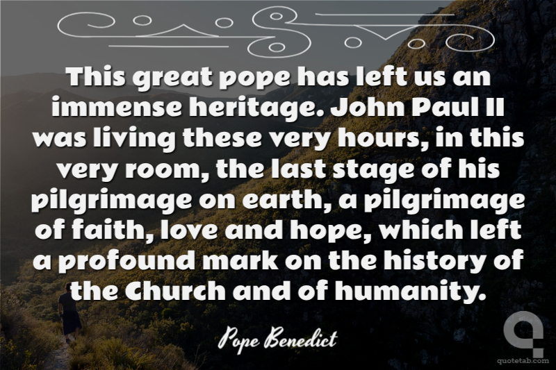 This great pope has left us an immense heritage. John Paul II was living these very hours, in this very room, the last stage of his pilgrimage on earth, a pilgrimage of faith, love and hope, which left a profound mark on the history of the Church and of humanity.