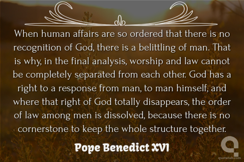 When human affairs are so ordered that there is no recognition of God, there is a belittling of man. That is why, in the final analysis, worship and law cannot be completely separated from each other. God has a right to a response from man, to man himself, and where that right of God totally disappears, the order of law among men is dissolved, because there is no cornerstone to keep the whole structure together.