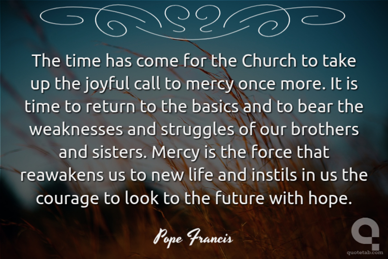 The time has come for the Church to take up the joyful call to mercy once more. It is time to return to the basics and to bear the weaknesses and struggles of our brothers and sisters. Mercy is the force that reawakens us to new life and instils in us the courage to look to the future with hope.