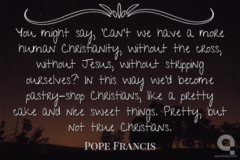 You might say, 'Can't we have a more human Christianity, without the cross, without Jesus, without stripping ourselves?' In this way we'd become pastry-shop Christians, like a pretty cake and nice sweet things. Pretty, but not true Christians.