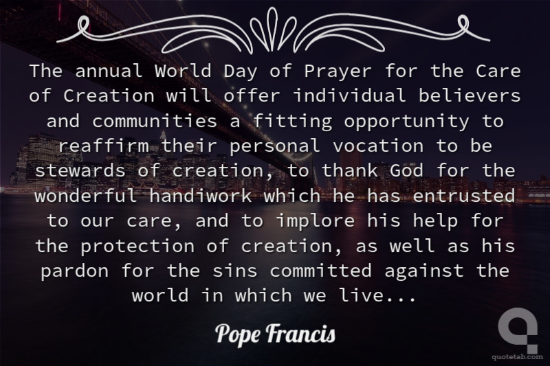 The annual World Day of Prayer for the Care of Creation will offer individual believers and communities a fitting opportunity to reaffirm their personal vocation to be stewards of creation, to thank God for the wonderful handiwork which he has entrusted to our care, and to implore his help for the protection of creation, as well as his pardon for the sins committed against the world in which we live...