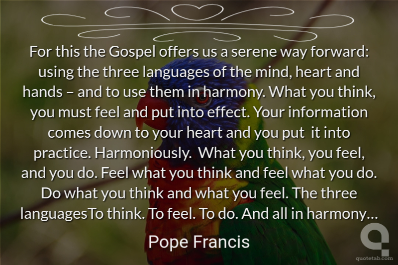 For this the Gospel offers us a serene way forward: using the three languages of the mind, heart and hands – and to use them in harmony. What you think, you must feel and put into effect. Your information comes down to your heart and you put it into practice. Harmoniously. What you think, you feel, and you do. Feel what you think and feel what you do. Do what you think and what you feel. The three languagesTo think. To feel. To do. And all in harmony…