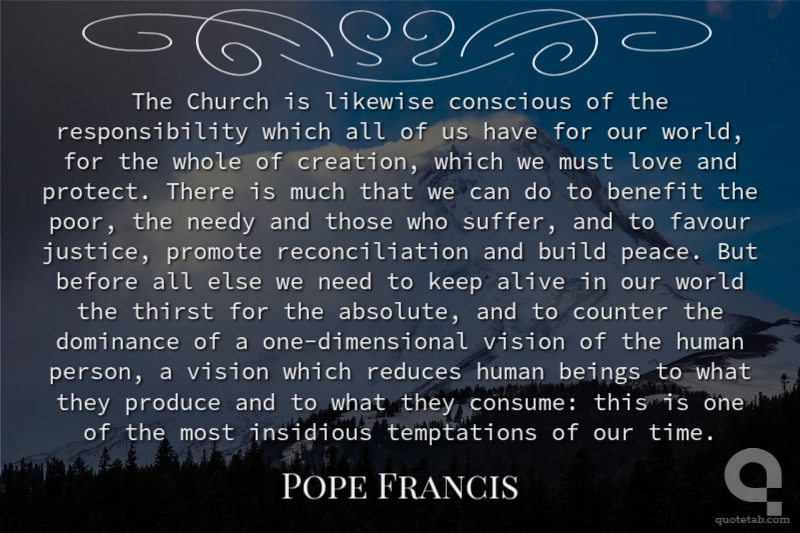 The Church is likewise conscious of the responsibility which all of us have for our world, for the whole of creation, which we must love and protect. There is much that we can do to benefit the poor, the needy and those who suffer, and to favour justice, promote reconciliation and build peace. But before all else we need to keep alive in our world the thirst for the absolute, and to counter the dominance of a one-dimensional vision of the human person, a vision which reduces human beings to what they produce and to what they consume: this is one of the most insidious temptations of our time.