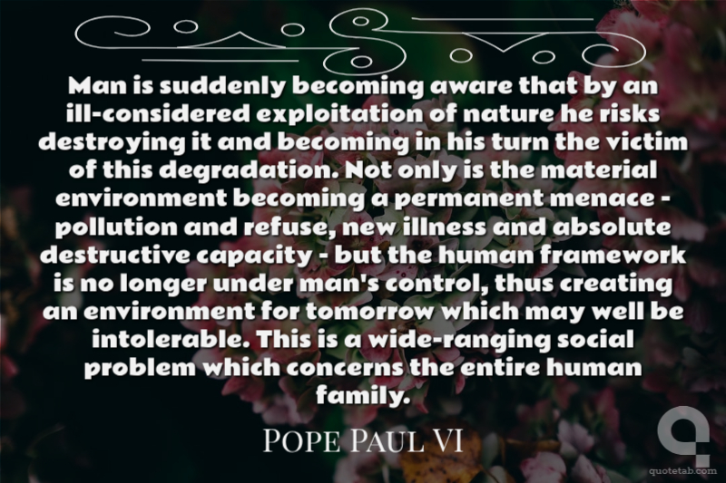 Man is suddenly becoming aware that by an ill-considered exploitation of nature he risks destroying it and becoming in his turn the victim of this degradation. Not only is the material environment becoming a permanent menace - pollution and refuse, new illness and absolute destructive capacity - but the human framework is no longer under man's control, thus creating an environment for tomorrow which may well be intolerable. This is a wide-ranging social problem which concerns the entire human family.