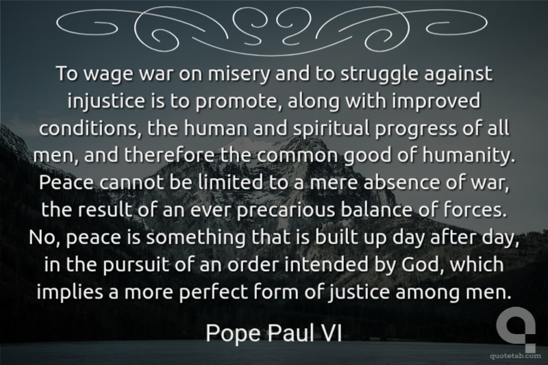 To wage war on misery and to struggle against injustice is to promote, along with improved conditions, the human and spiritual progress of all men, and therefore the common good of humanity. Peace cannot be limited to a mere absence of war, the result of an ever precarious balance of forces. No, peace is something that is built up day after day, in the pursuit of an order intended by God, which implies a more perfect form of justice among men.