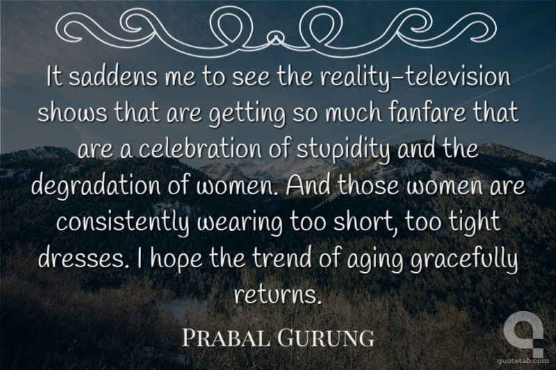 It saddens me to see the reality-television shows that are getting so much fanfare that are a celebration of stupidity and the degradation of women. And those women are consistently wearing too short, too tight dresses. I hope the trend of aging gracefully returns.