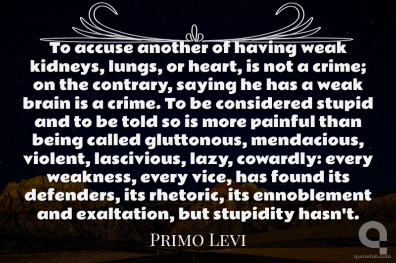 To accuse another of having weak kidneys, lungs, or heart, is not a crime; on the contrary, saying he has a weak brain is a crime. To be considered stupid and to be told so is more painful than being called gluttonous, mendacious, violent, lascivious, lazy, cowardly: every weakness, every vice, has found its defenders, its rhetoric, its ennoblement and exaltation, but stupidity hasn't.