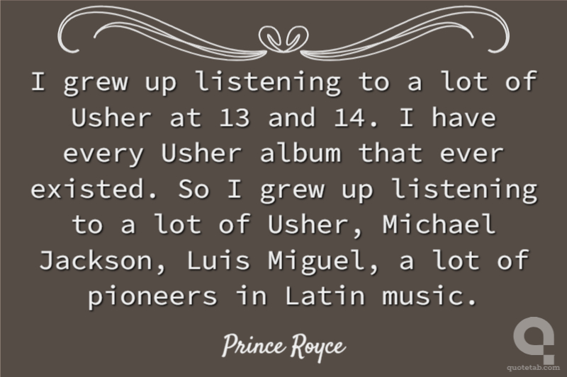 I grew up listening to a lot of Usher at 13 and 14. I have every Usher album that ever existed. So I grew up listening to a lot of Usher, Michael Jackson, Luis Miguel, a lot of pioneers in Latin music.