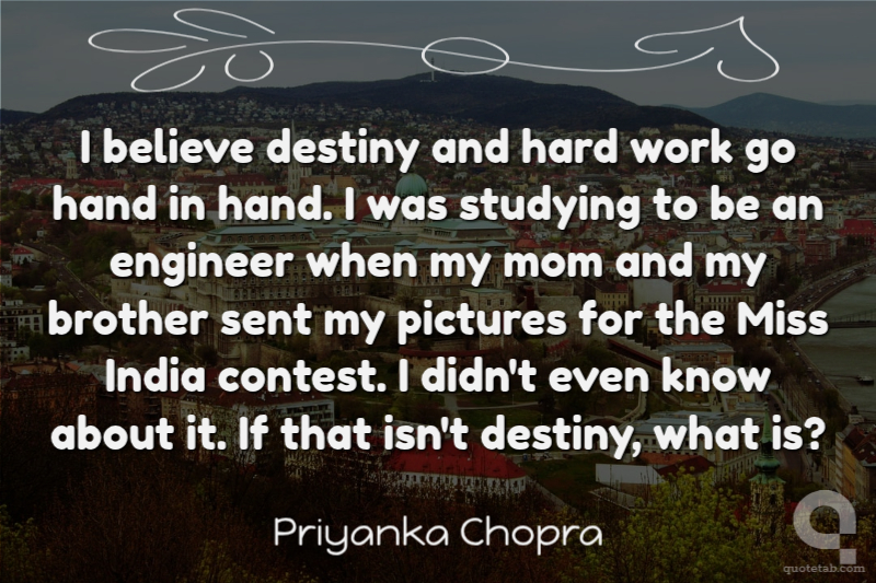 I believe destiny and hard work go hand in hand. I was studying to be an engineer when my mom and my brother sent my pictures for the Miss India contest. I didn't even know about it. If that isn't destiny, what is?