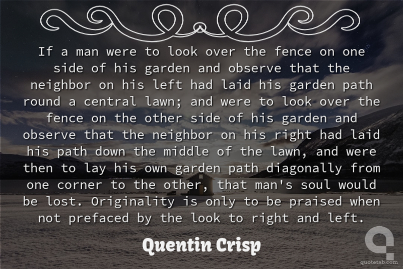 If a man were to look over the fence on one side of his garden and observe that the neighbor on his left had laid his garden path round a central lawn; and were to look over the fence on the other side of his garden and observe that the neighbor on his right had laid his path down the middle of the lawn, and were then to lay his own garden path diagonally from one corner to the other, that man's soul would be lost. Originality is only to be praised when not prefaced by the look to right and left.