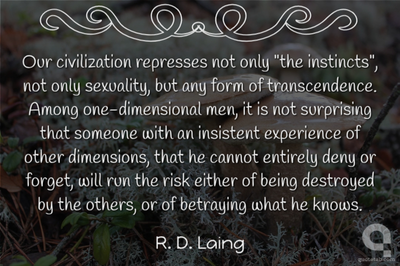 Our civilization represses not only "the instincts", not only sexuality, but any form of transcendence. Among one-dimensional men, it is not surprising that someone with an insistent experience of other dimensions, that he cannot entirely deny or forget, will run the risk either of being destroyed by the others, or of betraying what he knows.