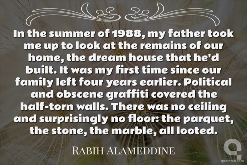 In the summer of 1988, my father took me up to look at the remains of our home, the dream house that he'd built. It was my first time since our family left four years earlier. Political and obscene graffiti covered the half-torn walls. There was no ceiling and surprisingly no floor: the parquet, the stone, the marble, all looted.