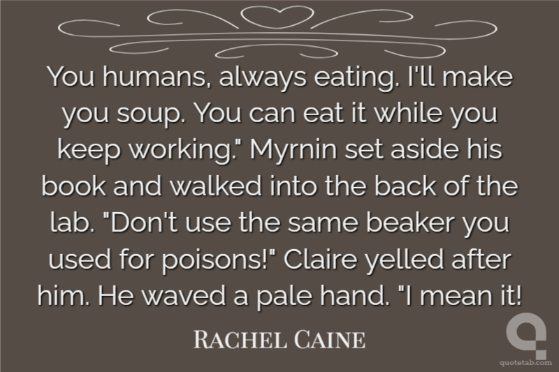 You humans, always eating. I'll make you soup. You can eat it while you keep working." Myrnin set aside his book and walked into the back of the lab. "Don't use the same beaker you used for poisons!" Claire yelled after him. He waved a pale hand. "I mean it!