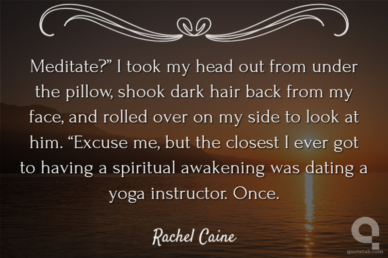 Meditate?” I took my head out from under the pillow, shook dark hair back from my face, and rolled over on my side to look at him. “Excuse me, but the closest I ever got to having a spiritual awakening was dating a yoga instructor. Once.