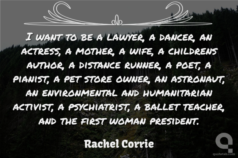 I want to be a lawyer, a dancer, an actress, a mother, a wife, a children's author, a distance runner, a poet, a pianist, a pet store owner, an astronaut, an environmental and humanitarian activist, a psychiatrist, a ballet teacher, and the first woman president.