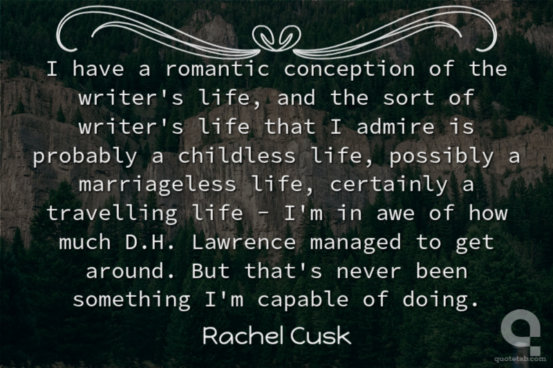 I have a romantic conception of the writer's life, and the sort of writer's life that I admire is probably a childless life, possibly a marriageless life, certainly a travelling life - I'm in awe of how much D.H. Lawrence managed to get around. But that's never been something I'm capable of doing.