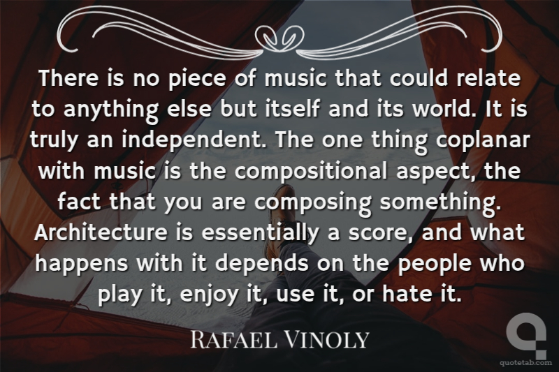 There is no piece of music that could relate to anything else but itself and its world. It is truly an independent. The one thing coplanar with music is the compositional aspect, the fact that you are composing something. Architecture is essentially a score, and what happens with it depends on the people who play it, enjoy it, use it, or hate it.