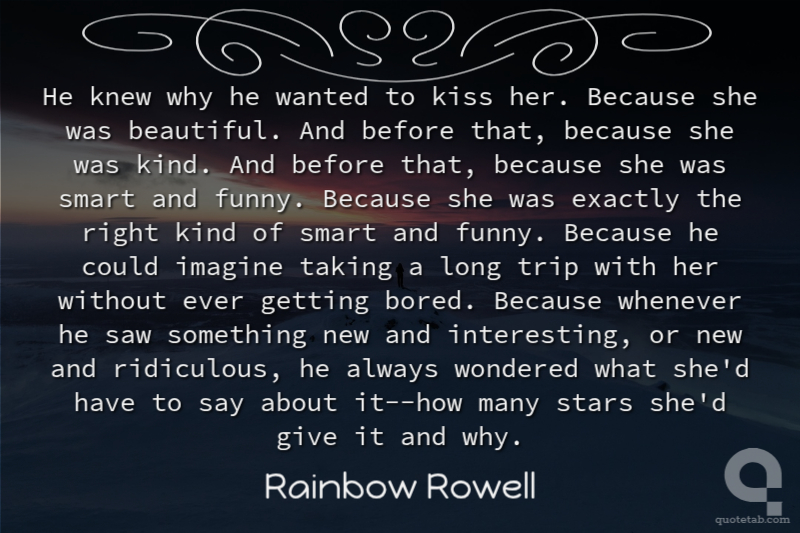 He knew why he wanted to kiss her. Because she was beautiful. And before that, because she was kind. And before that, because she was smart and funny. Because she was exactly the right kind of smart and funny. Because he could imagine taking a long trip with her without ever getting bored. Because whenever he saw something new and interesting, or new and ridiculous, he always wondered what she'd have to say about it--how many stars she'd give it and why.