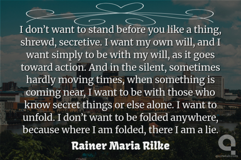 I don’t want to stand before you like a thing, shrewd, secretive. I want my own will, and I want simply to be with my will, as it goes toward action. And in the silent, sometimes hardly moving times, when something is coming near, I want to be with those who know secret things or else alone. I want to unfold. I don’t want to be folded anywhere, because where I am folded, there I am a lie.