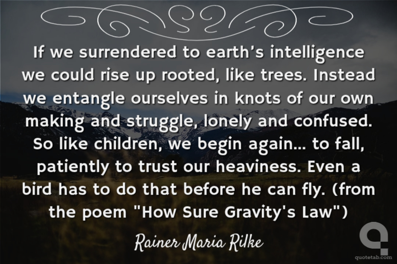 If we surrendered to earth’s intelligence we could rise up rooted, like trees. Instead we entangle ourselves in knots of our own making and struggle, lonely and confused. So like children, we begin again... to fall, patiently to trust our heaviness. Even a bird has to do that before he can fly. (from the poem "How Sure Gravity's Law")
