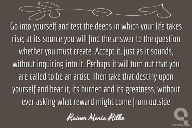 Go into yourself and test the deeps in which your life takes rise; at its source you will find the answer to the question whether you must create. Accept it, just as it sounds, without inquiring into it. Perhaps it will turn out that you are called to be an artist. Then take that destiny upon yourself and bear it, its burden and its greatness, without ever asking what reward might come from outside