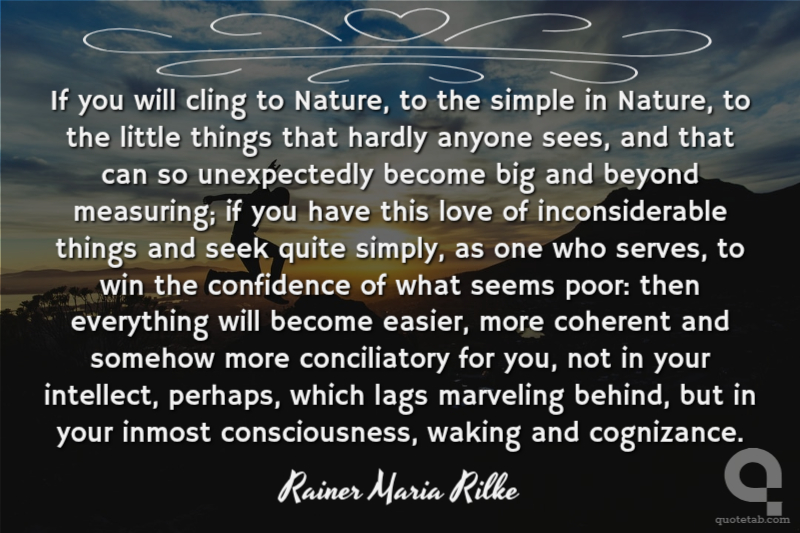 If you will cling to Nature, to the simple in Nature, to the little things that hardly anyone sees, and that can so unexpectedly become big and beyond measuring; if you have this love of inconsiderable things and seek quite simply, as one who serves, to win the confidence of what seems poor: then everything will become easier, more coherent and somehow more conciliatory for you, not in your intellect, perhaps, which lags marveling behind, but in your inmost consciousness, waking and cognizance.